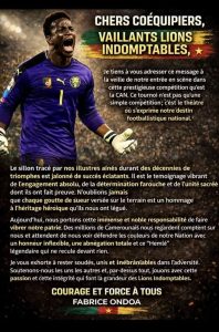 Un message lourd de sens et de symbole dans ce moment important. Fabrice Ondoua parle en connaissance de cause. Car il fait partie des héros de l’expédition gabonaise en 2017. Personne n’y croyait parce que Hugo Broos n’avait pas de grande vedette dans son effectif. Ondoua avait élevé le niveau pour conduire le Cameroun vers son 5e titre. Il invite les Lions Indomptables à rester soudés, unis et inébranlables dans l’adversité.