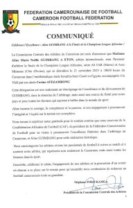 C’est désormais officiel. Aline Marie Noëlle Guimbang A Etong va diriger la finale de la Champions League africaine. Elle a été désignée par la Confédération africaine de football (CAF) pour départager les deux meilleurs clubs du continent. Il s’agit de l’ASEC Mimosas et AS Far de Rabat. Ils vont s’affronter ce 21 novembre dès 18 heures au stade Ismaïlia-Suez Canal en Egypte. On s’attend à vivre une finale âprement disputée.