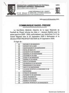 Au total, 32 clubs figurent sur cette liste initiale, marquant la première étape de l’engagement des équipes. L’information majeure pour les supporters est la confirmation de l’éligibilité de Fovu Club de Baham, un club historique de la région, qui est bien positionné pour participer à cette nouvelle saison. Sa présence est un gage de compétitivité et d’intérêt pour le championnat régional.