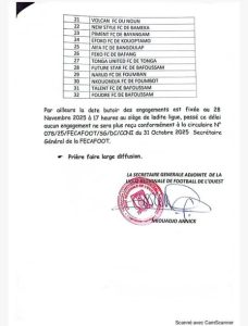 Passé ce délai, les clubs retardataires s’exposent à une exclusion pure et simple. Cette rigueur fait suite à la circulaire du Secrétaire Général de la Fecafoot signée le 31 octobre 2025, qui appelle à une application stricte des règlements pour garantir la bonne organisation et le respect du calendrier de la saison 2025/2026.