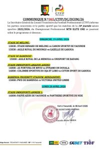 Au stade de proximité de Mendankwe, Public work department (Pwd) de Bamenda aura fort à faire contre Victoria United. Un grand duel à suivre au regard de la rivalité dans les airs. Le match aller a laissé transpirer une grosse polémique au sujet de l’arbitrage. C’est un match à suivre de près. La dernière rencontre de cette 14e journée de la Mtn Elite One est à suivre au stade omnisports Ahmadou Ahidjo le lundi 20 avril 2026. Fauve Azur sera face à Panthère sportive du Ndé.