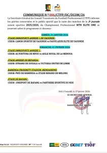 Ce samedi 31 janvier 2026, Canon sportif de Yaoundé affronte Fauve Azur au stade annexe 1 de l’omnisport à partir de 15h30. Sur les mêmes installations dimanche, As Fortuna aura fort à faire contre Aigle royal de la Menoua. Dynamo de Douala offre son hospitalité à Victoria United au stade annexe de Bepanda. A Bamenda, PWD reçoit Stade Renard de Melong et Unisport du Haut Nkam sera face à l’adversité de Panthère sportive du Ndé dans le cadre du derby.
